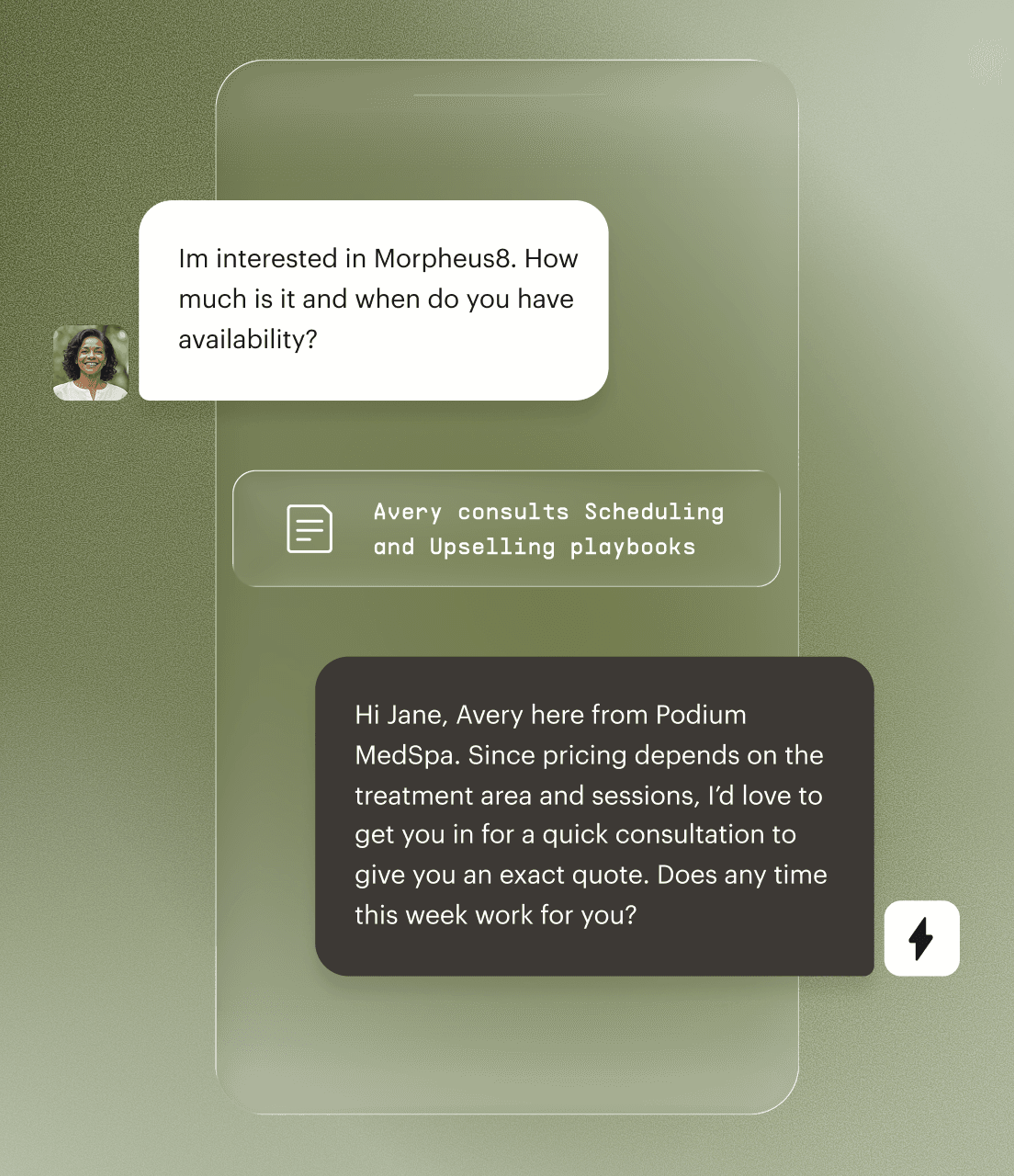 Avery follows your practice’s playbooks for talking with leads and patients, leaning into whatever sales approach you prefer—a hard sale, consultative language, and beyond, sensing the right tone given the context.