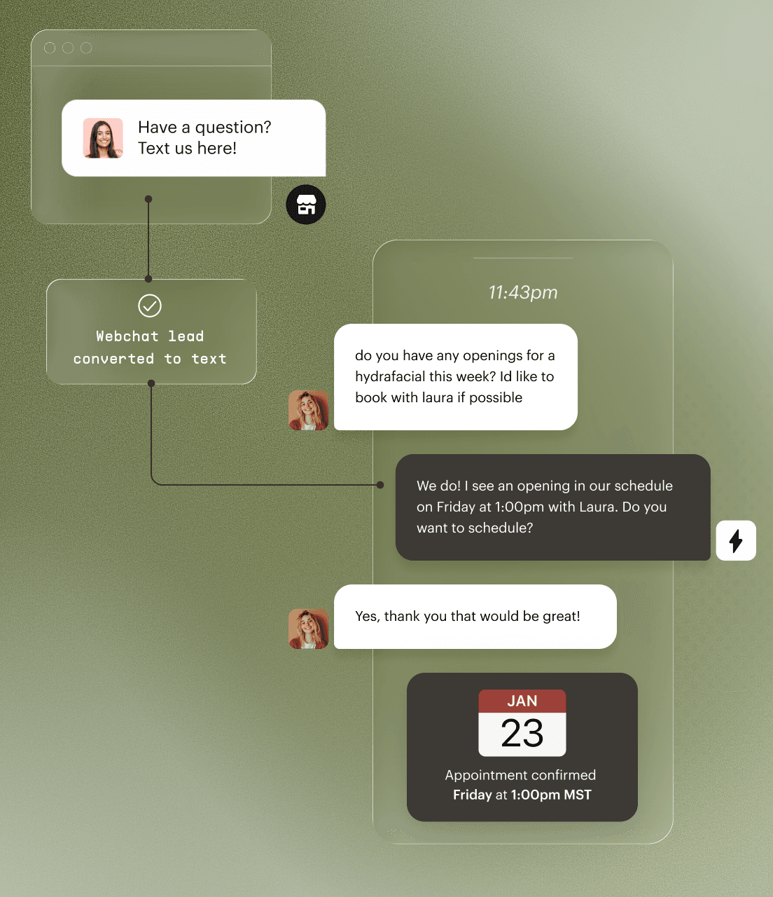 Avery responds to texts in under 2 minutes with a natural, human-like tone, day and night, so no lead is left waiting and your schedule stays full.