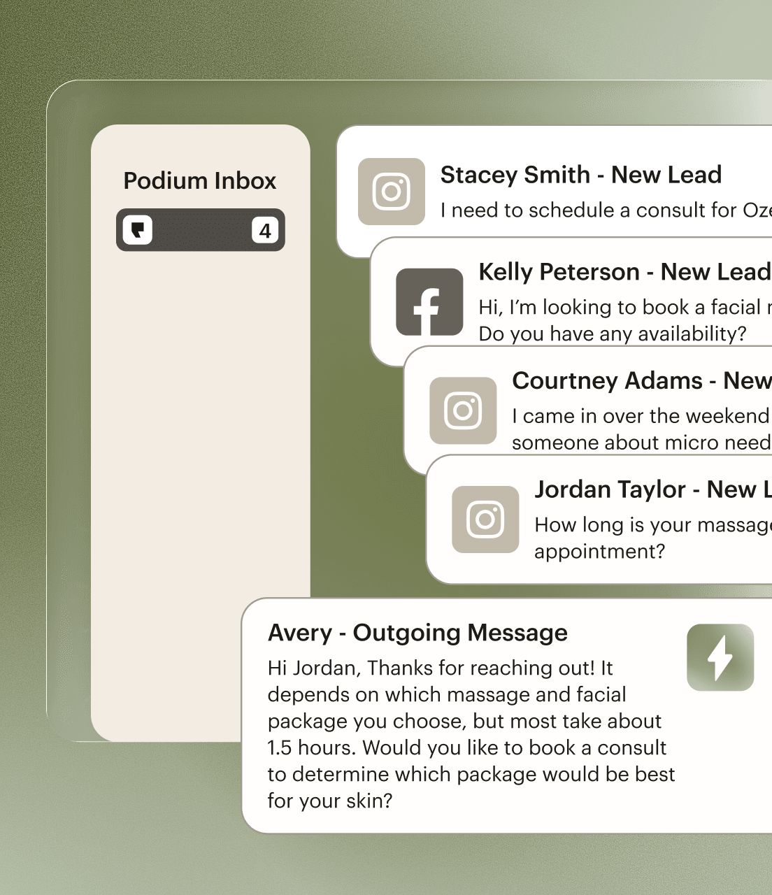 Route Instagram, Facebook, and ad leads into one inbox. Avery replies instantly to turn inquiries into booked appointments.